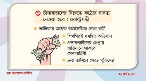 সারা দেশে শীর্ষ চাঁদাবাজ ৬৫১ জন। এর মধ্যে খোদ রাজধানী ঢাকাতেই রয়েছে ৩২৪ জন। মোঃ শহিদুল ইসলাম জনি Mar 30, 2026 at 22:00 এদের বড় একটি অংশ শুধু…